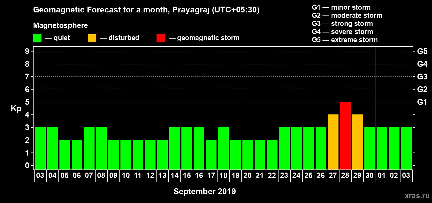 Geomagnetic storm forecast in Prayagraj for Sep 03, 2019