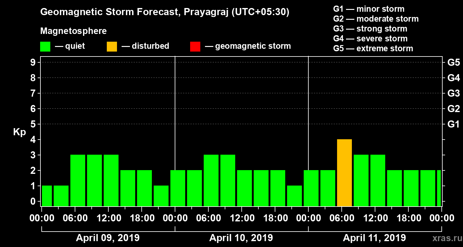 Geomagnetic storm forecast in Prayagraj for Apr 09, 2019
