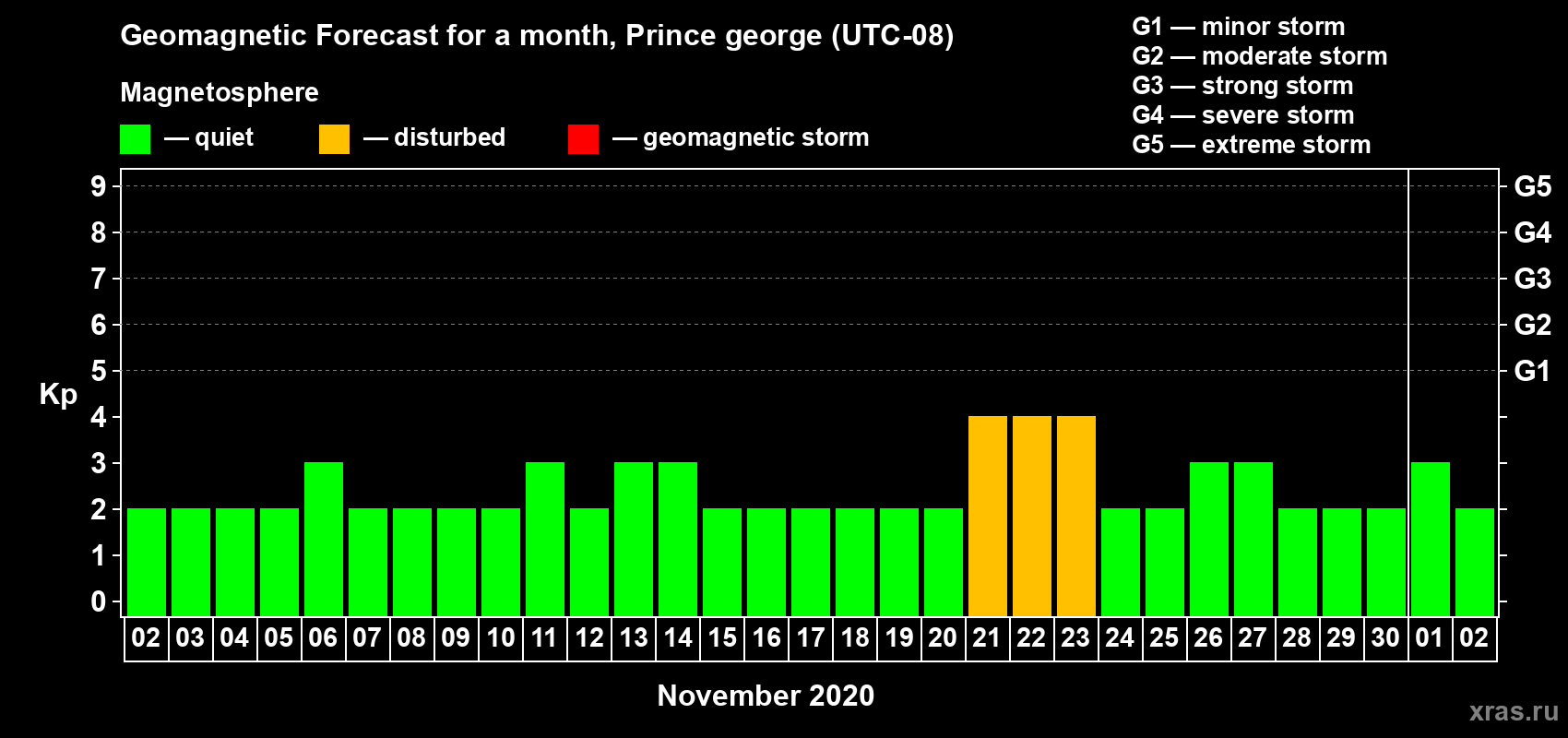 Geomagnetic storm forecast in Prince george for Nov 02, 2020