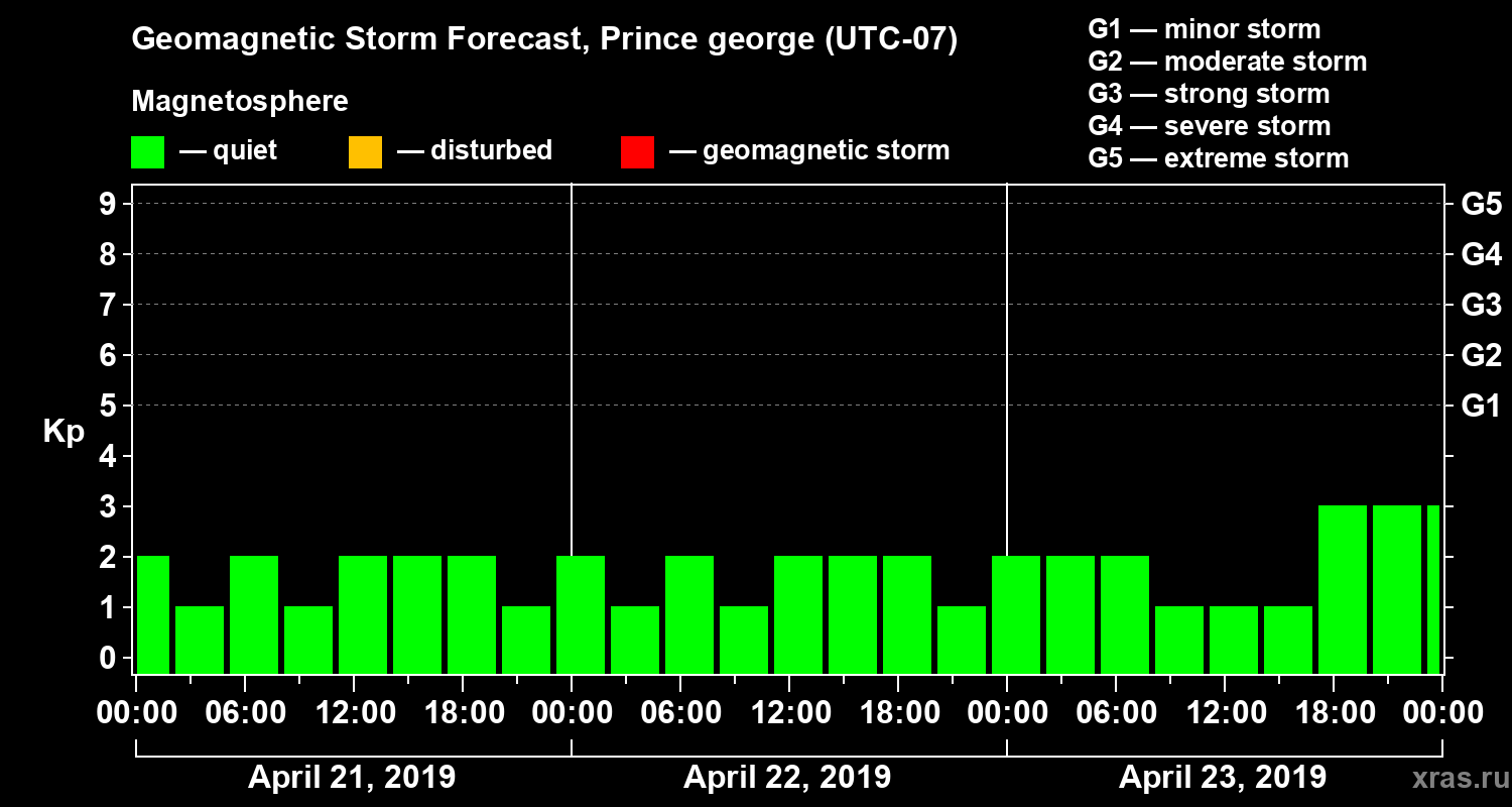 Geomagnetic storm forecast in Prince george for Apr 21, 2019