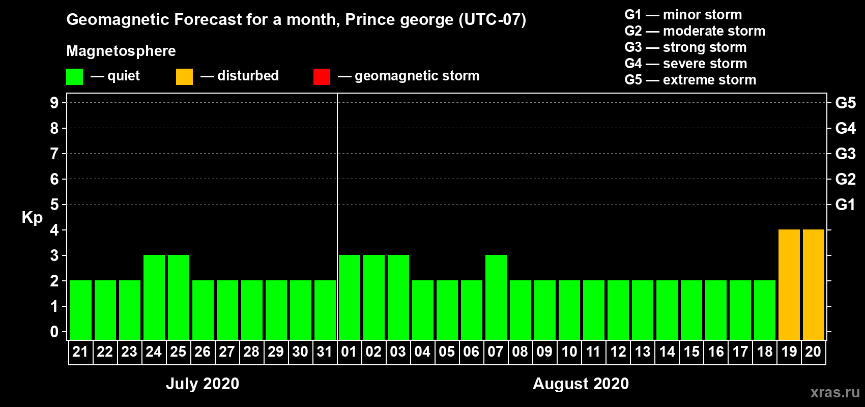 Geomagnetic storm forecast in Prince george for Jul 21, 2020