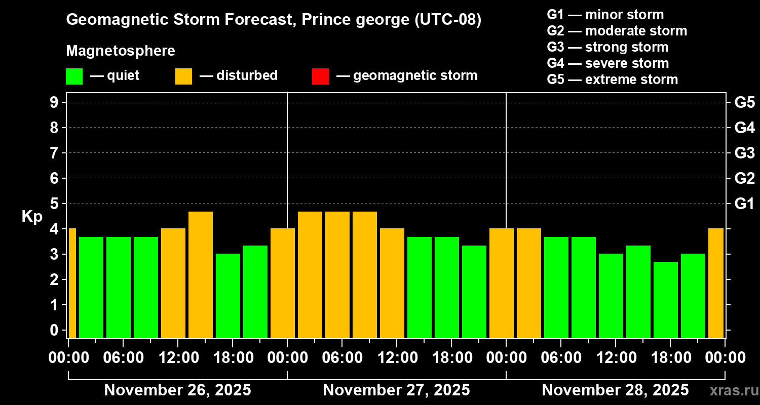 Geomagnetic storm forecast in Prince george for Nov 26, 2025
