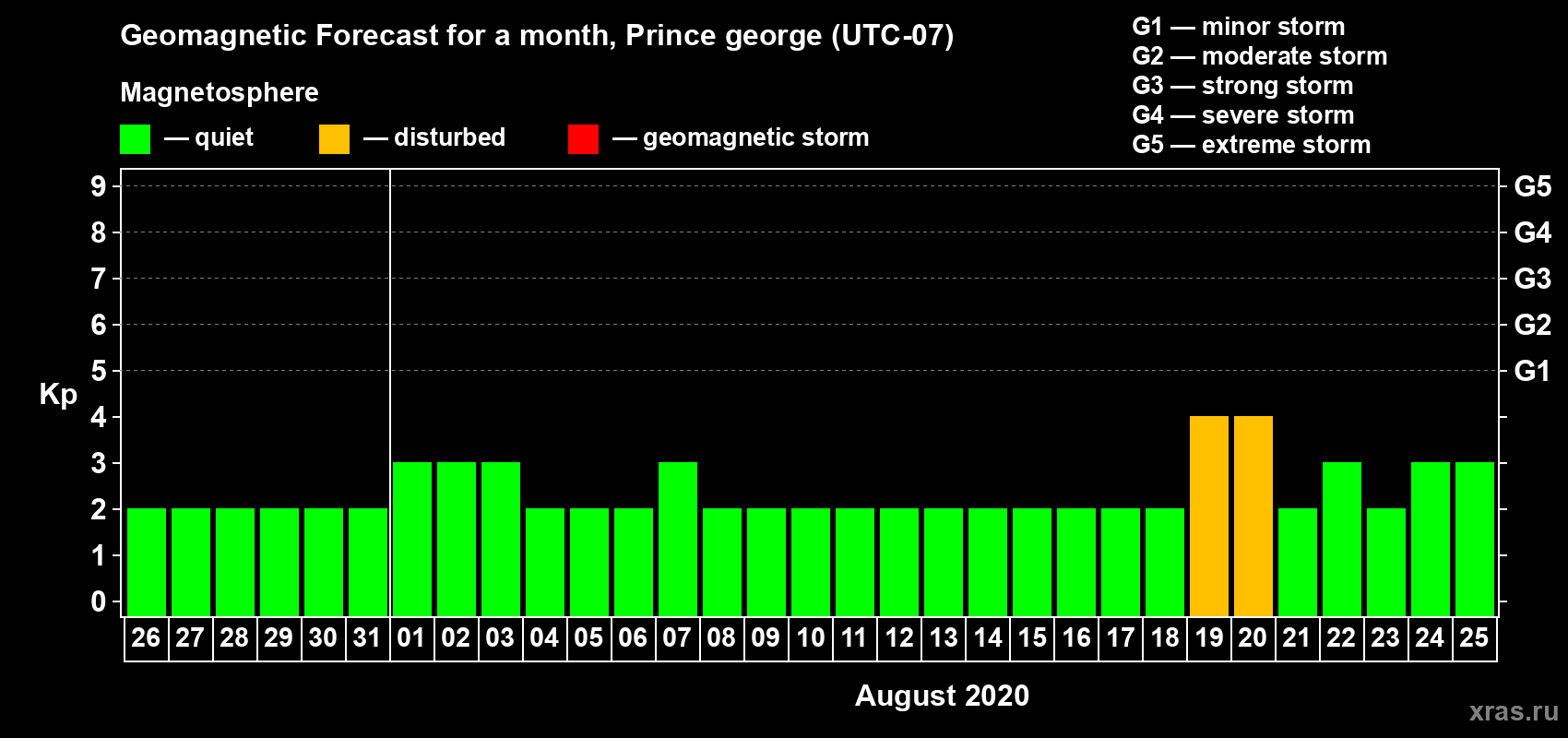 Geomagnetic storm forecast in Prince george for Jul 26, 2020