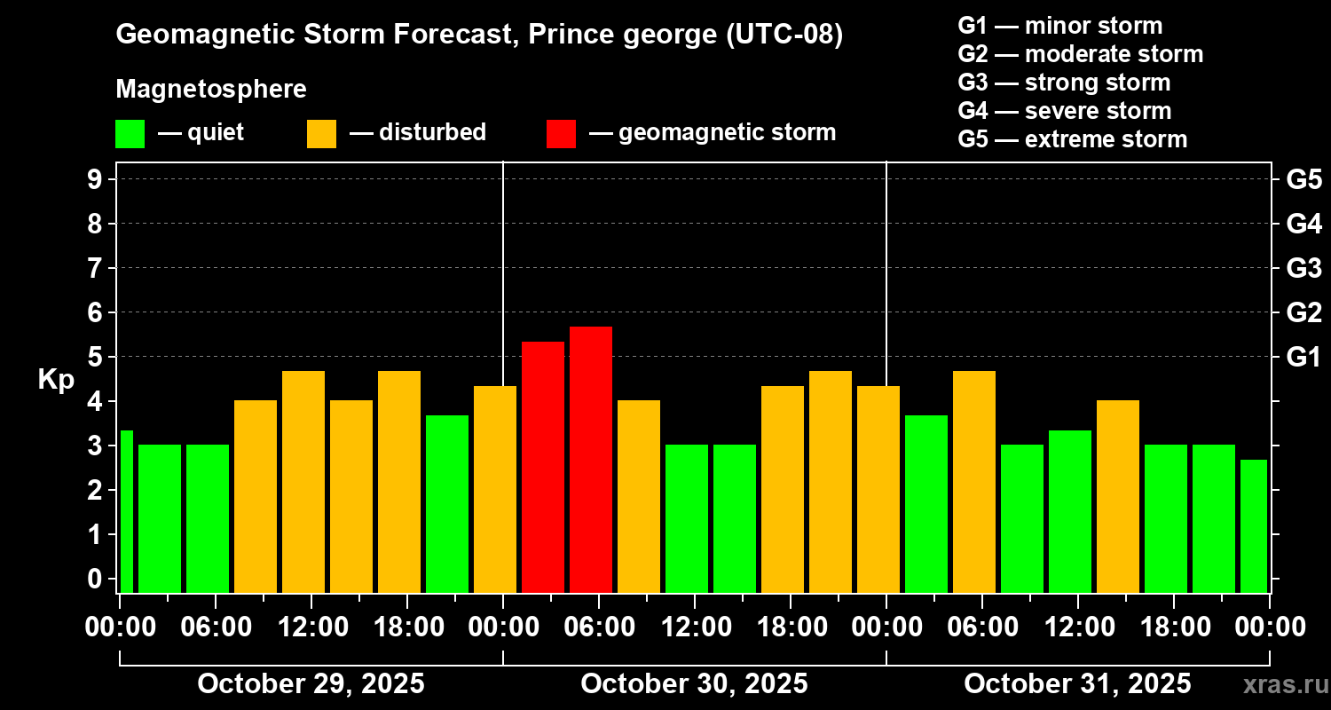 Geomagnetic storm forecast in Prince george for Oct 29, 2025