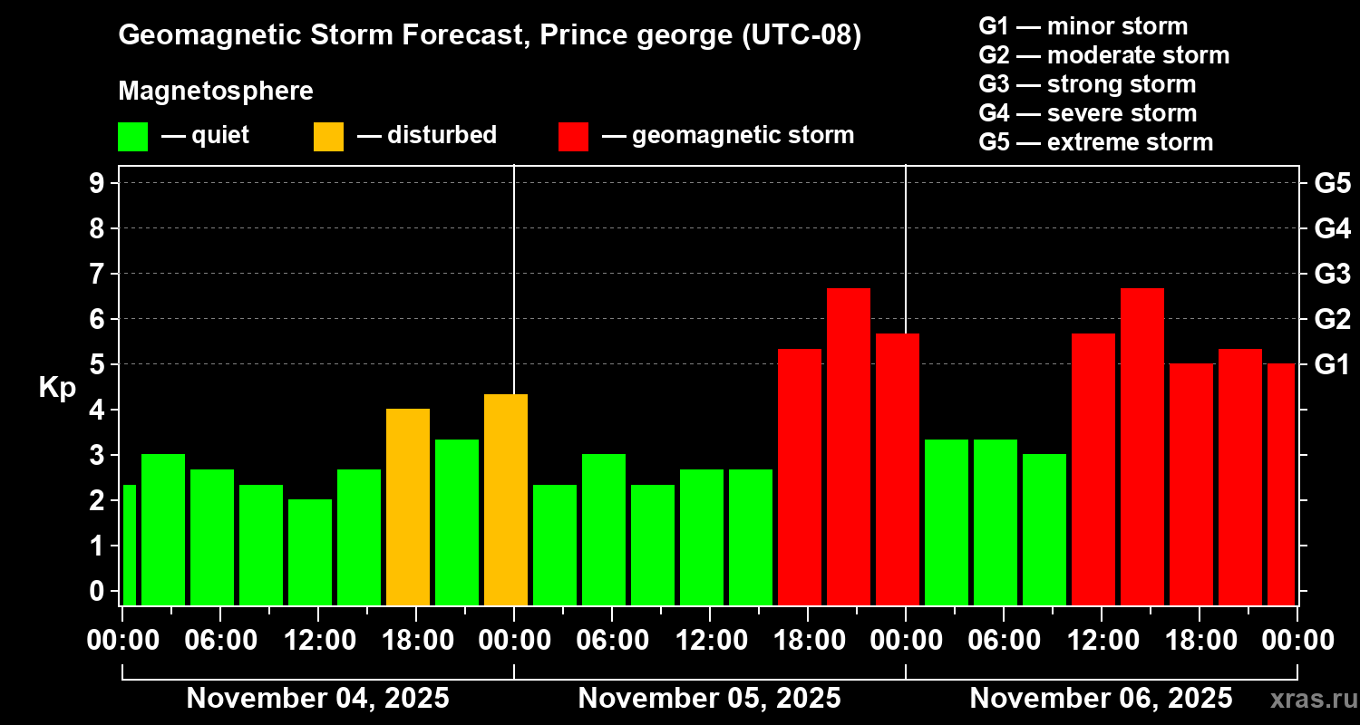 Geomagnetic storm forecast in Prince george for Nov 04, 2025