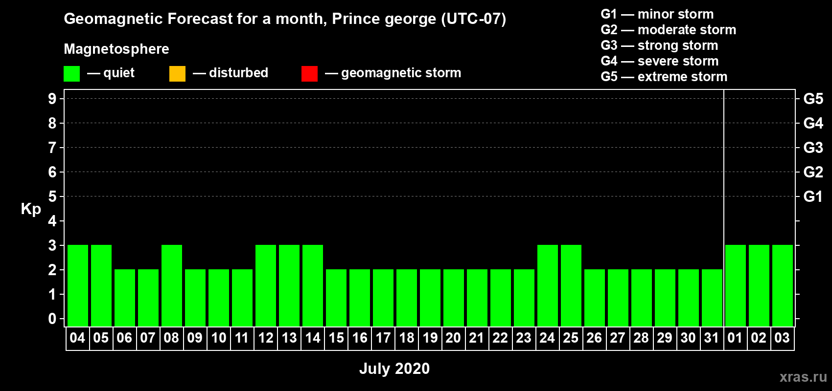 Geomagnetic storm forecast in Prince george for Jul 04, 2020