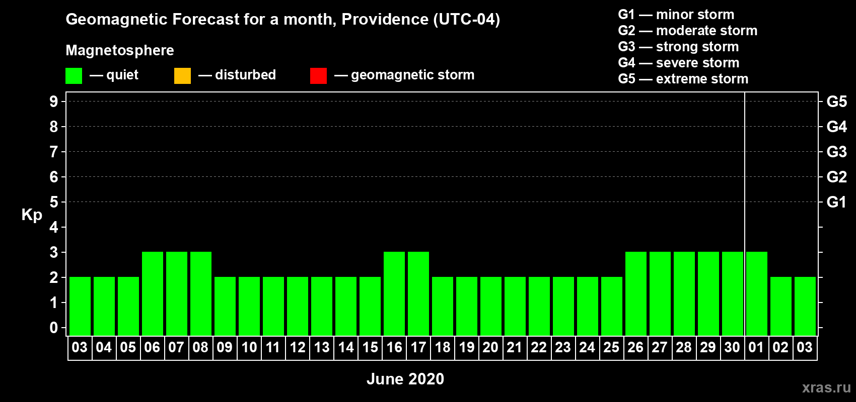 Geomagnetic storm forecast in Providence for Jun 03, 2020