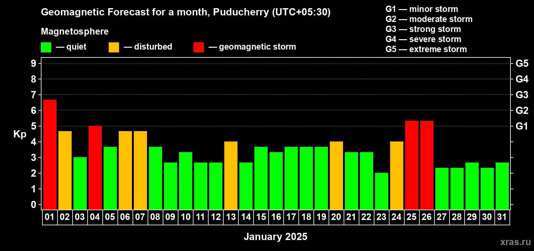 Geomagnetic storm forecast in Puducherry for Jan 01, 2025
