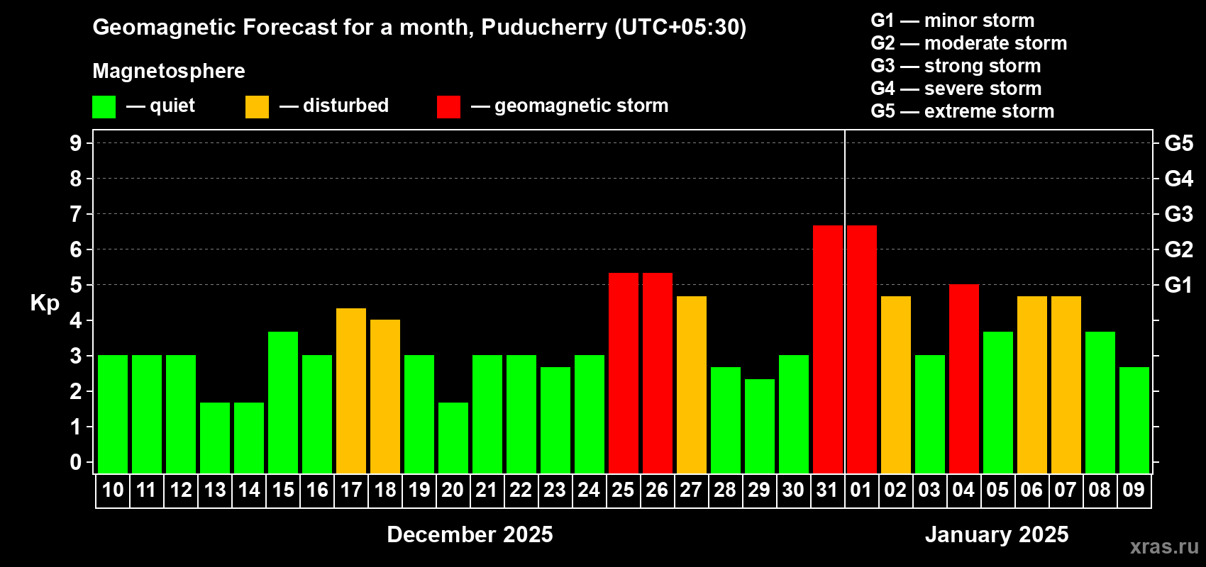 Geomagnetic storm forecast in Puducherry for Dec 10, 2024