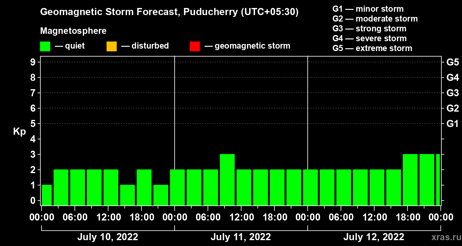 Geomagnetic storm forecast in Puducherry for Jul 10, 2022