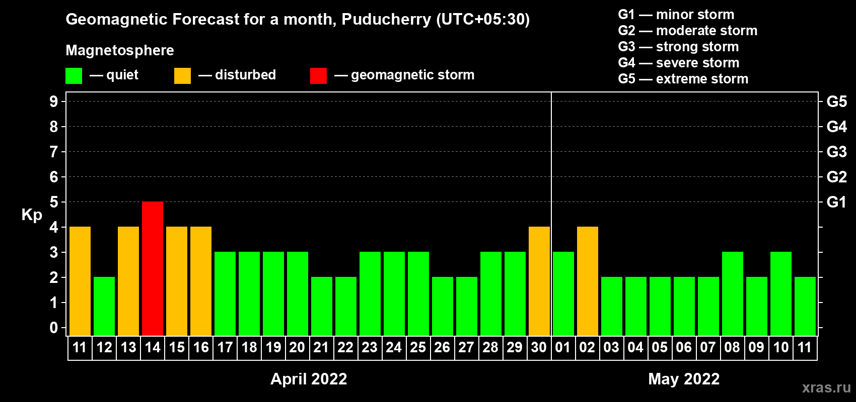 Geomagnetic storm forecast in Puducherry for Apr 11, 2022