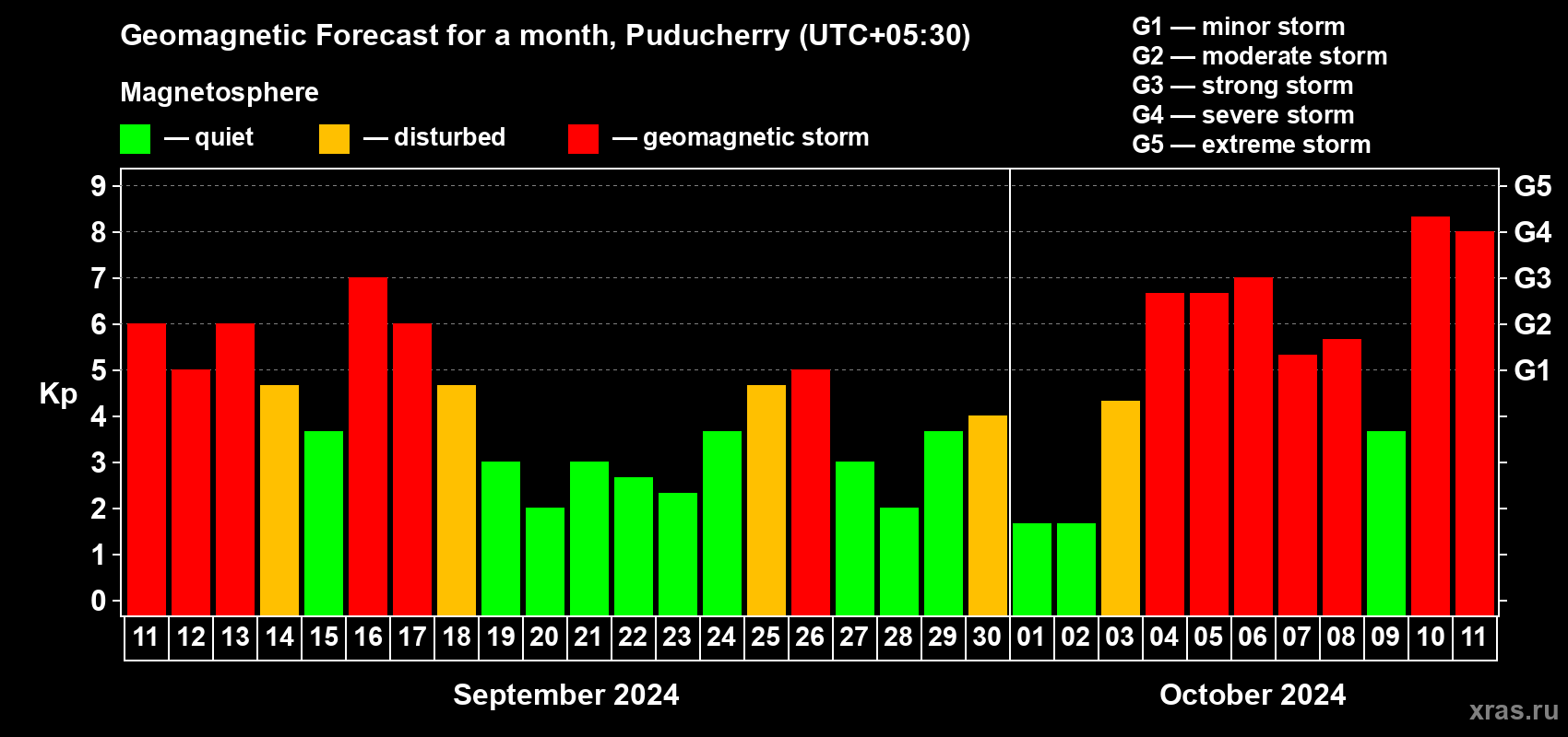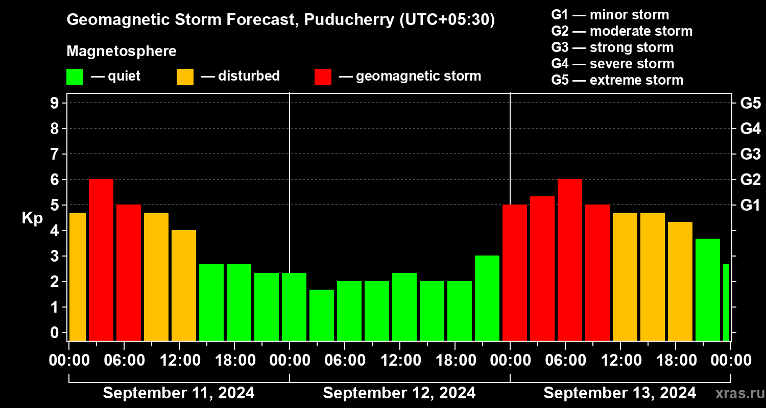 Geomagnetic storm forecast in Puducherry for Sep 11, 2024