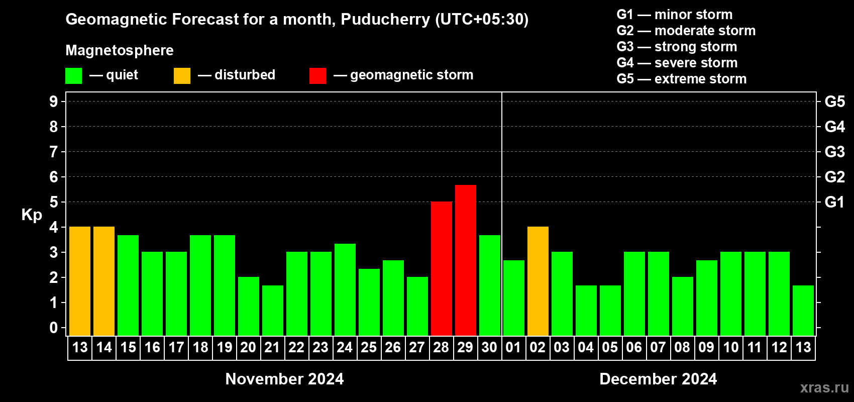 Geomagnetic storm forecast in Puducherry for Nov 13, 2024