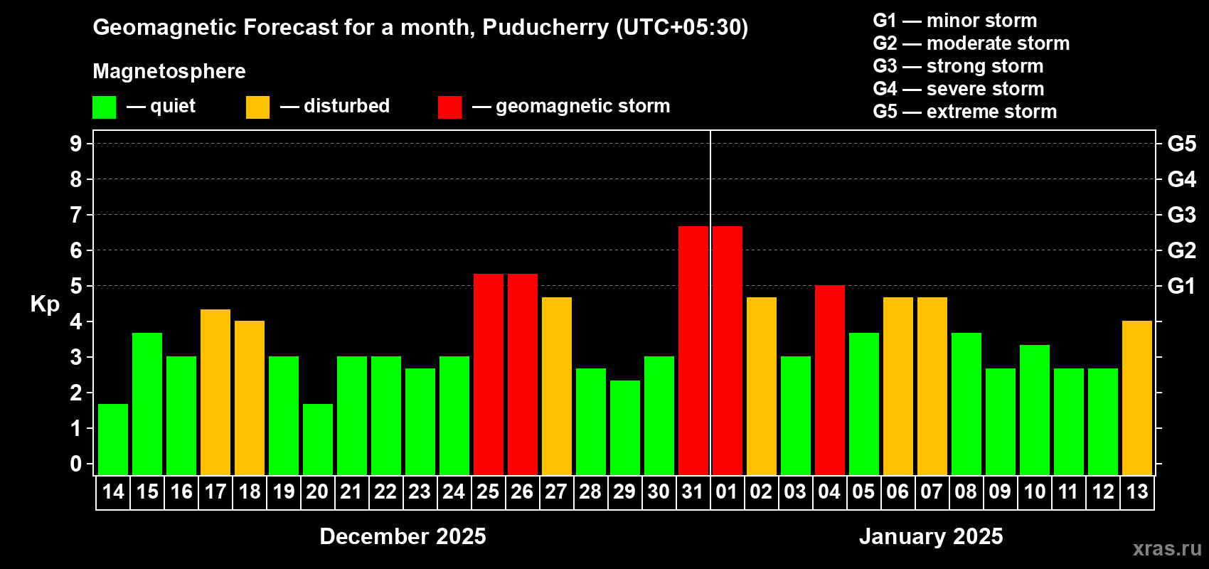 Geomagnetic storm forecast in Puducherry for Dec 14, 2024