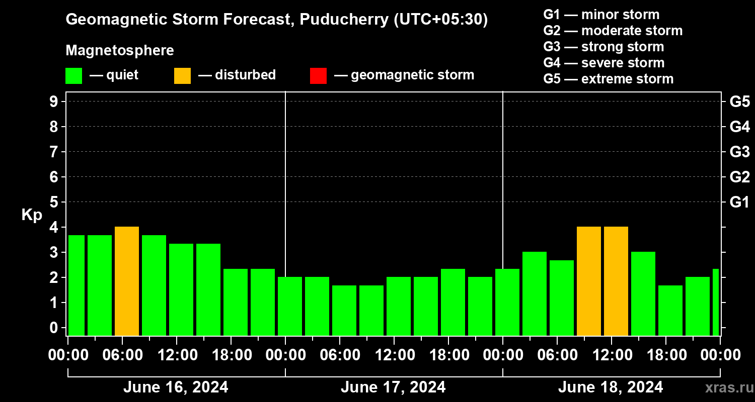Geomagnetic storm forecast in Puducherry for Jun 16, 2024
