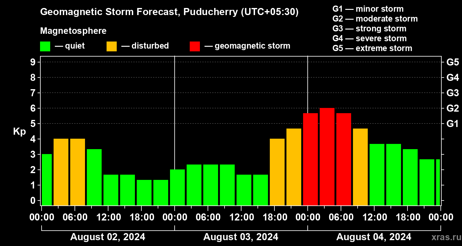 Geomagnetic storm forecast in Puducherry for Aug 02, 2024