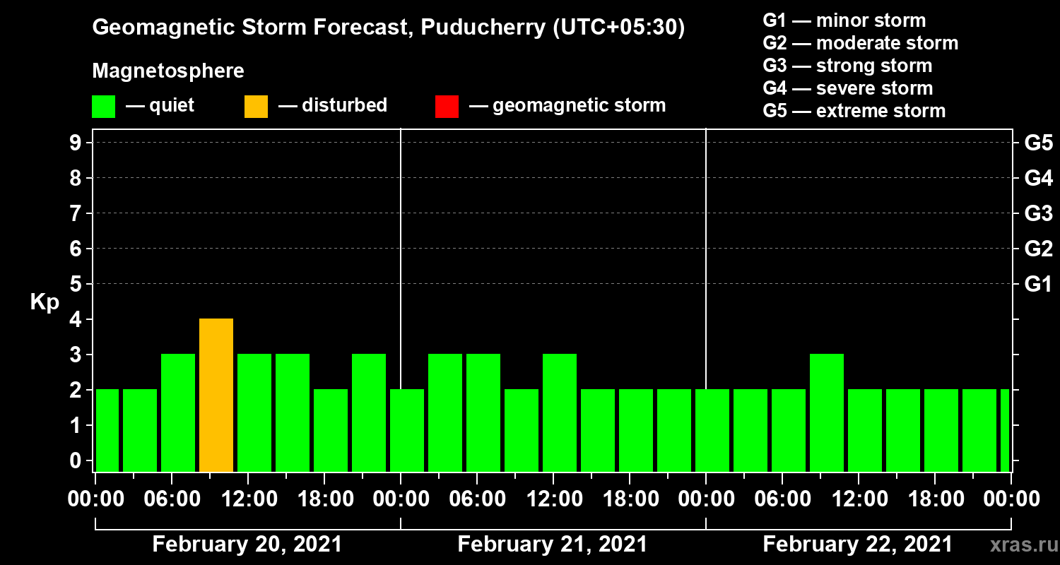 Geomagnetic storm forecast in Puducherry for Feb 20, 2021