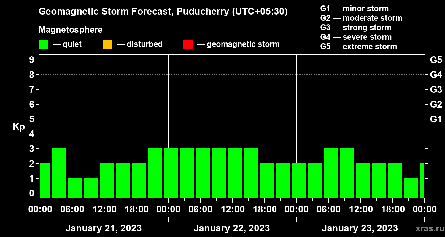 Geomagnetic storm forecast in Puducherry for Jan 21, 2023