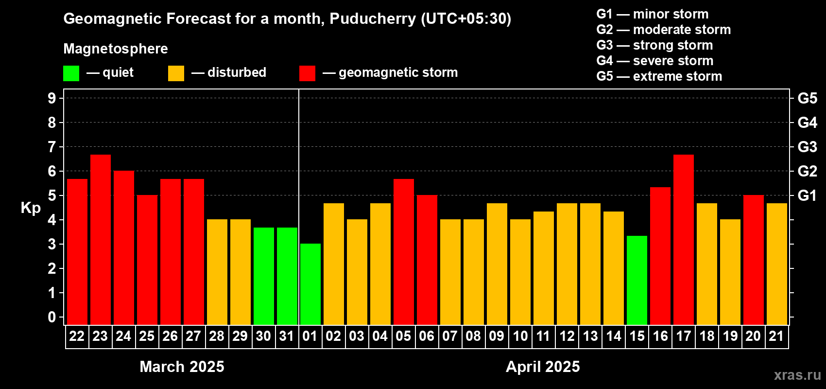 Geomagnetic storm forecast in Puducherry for Mar 22, 2025