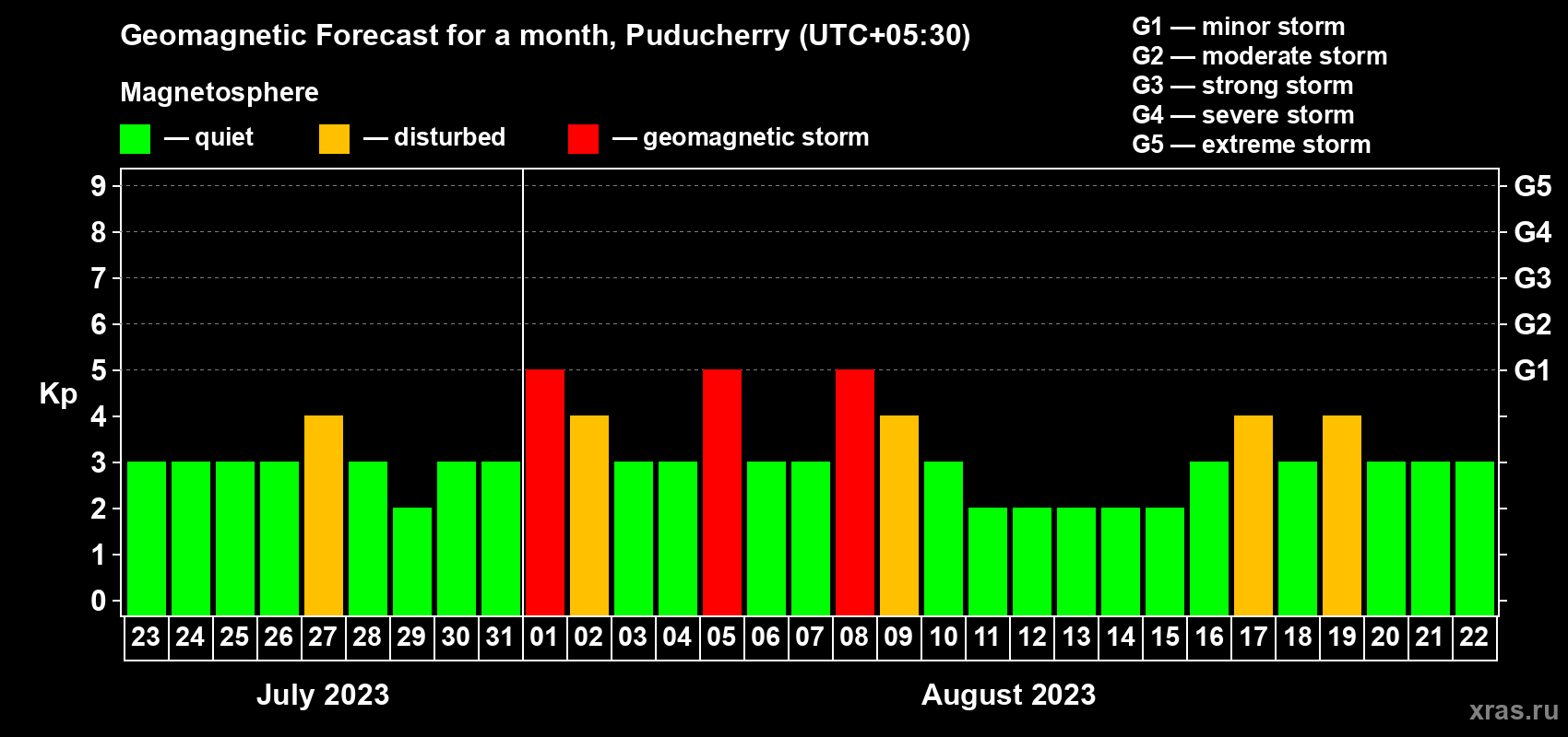 Geomagnetic storm forecast in Puducherry for Jul 23, 2023