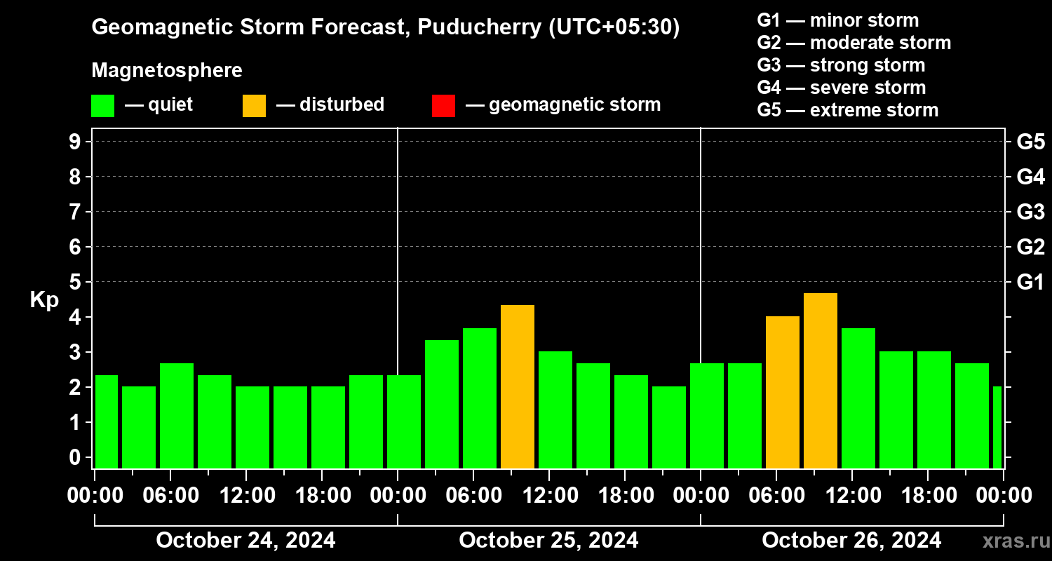 Geomagnetic storm forecast in Puducherry for Oct 24, 2024