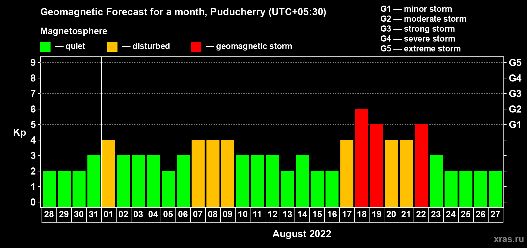 Geomagnetic storm forecast in Puducherry for Jul 28, 2022