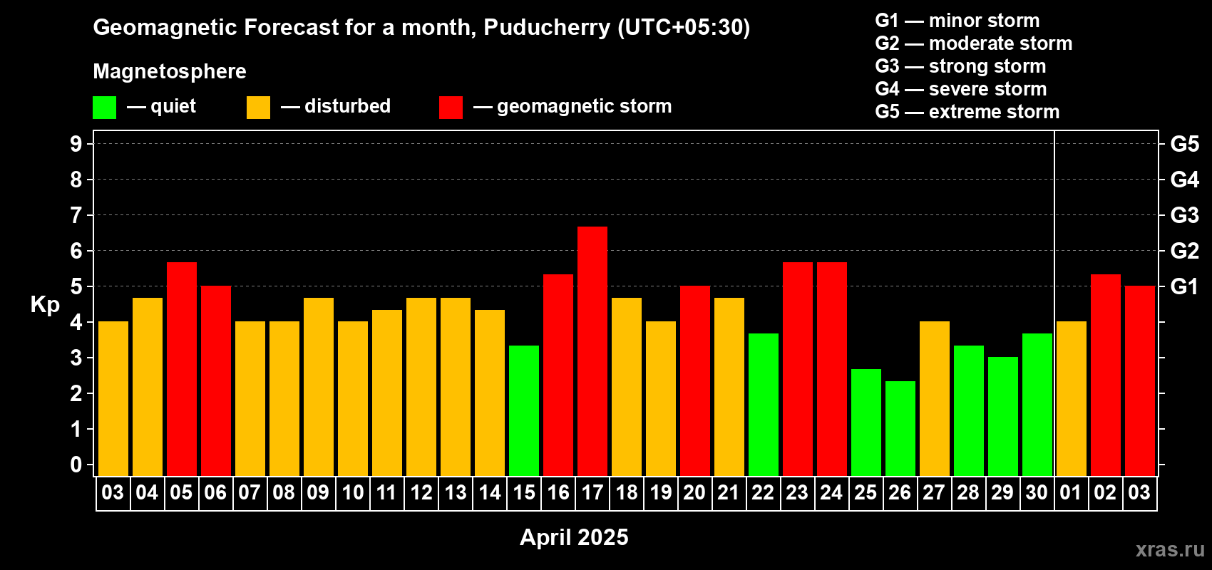 Geomagnetic storm forecast in Puducherry for Apr 03, 2025
