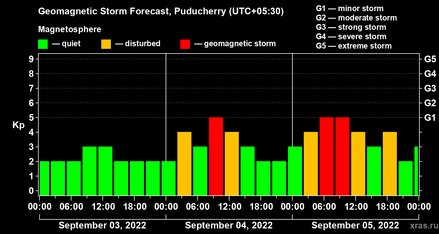 Geomagnetic storm forecast in Puducherry for Sep 03, 2022