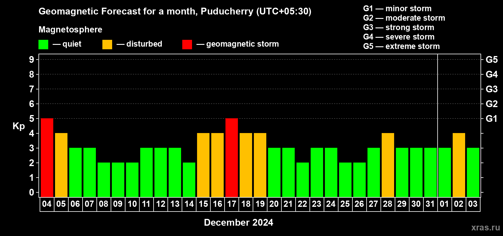 Geomagnetic storm forecast in Puducherry for Dec 04, 2023