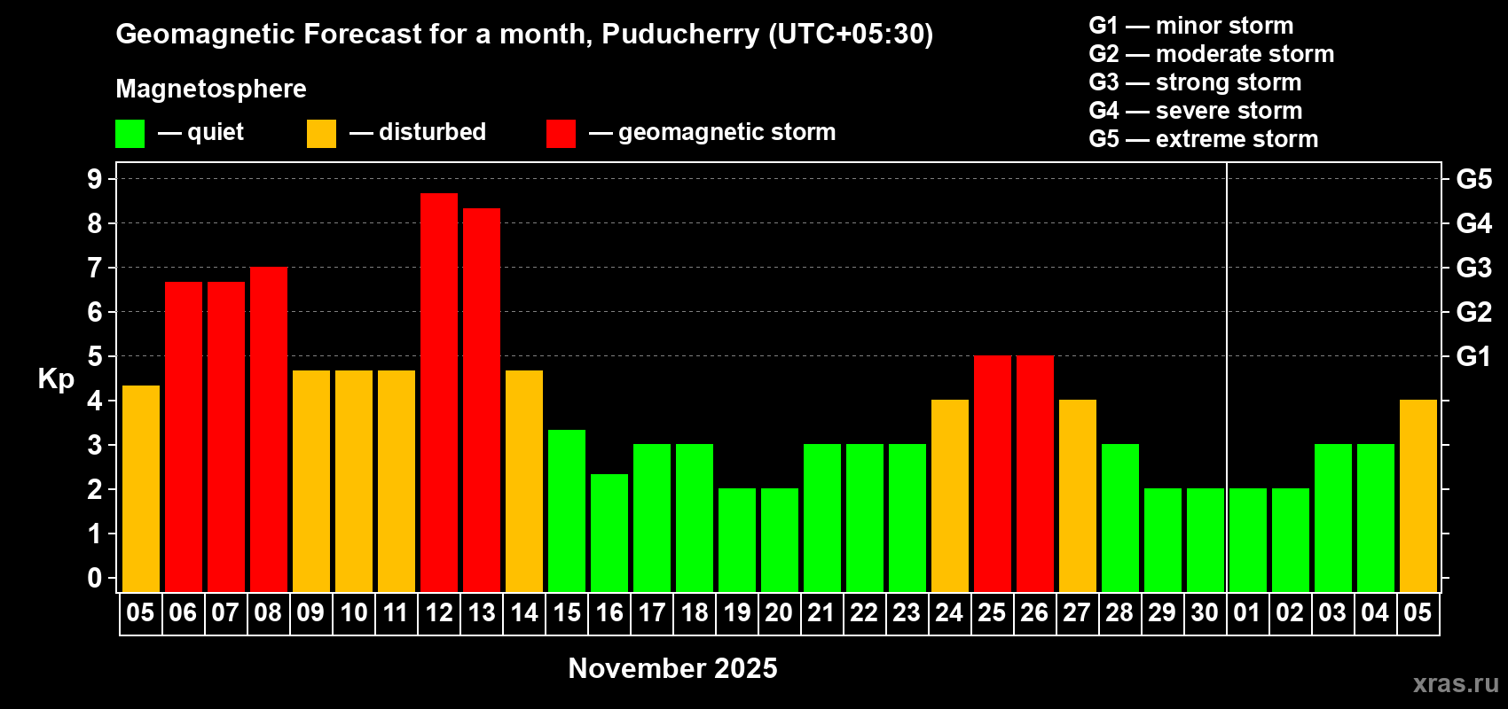 Geomagnetic storm forecast in Puducherry for Nov 05, 2025