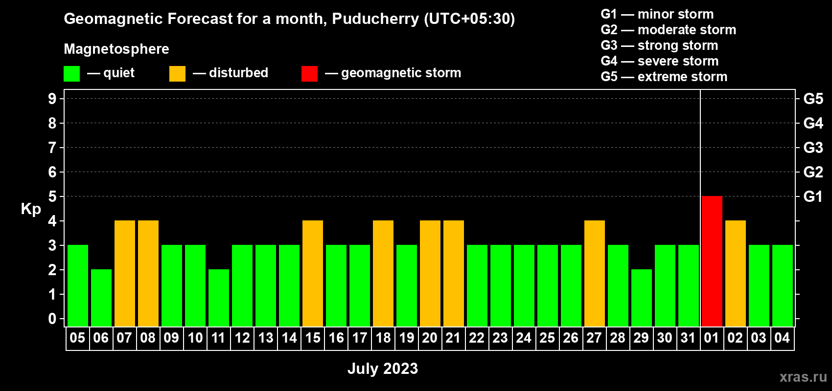 Geomagnetic storm forecast in Puducherry for Jul 05, 2023