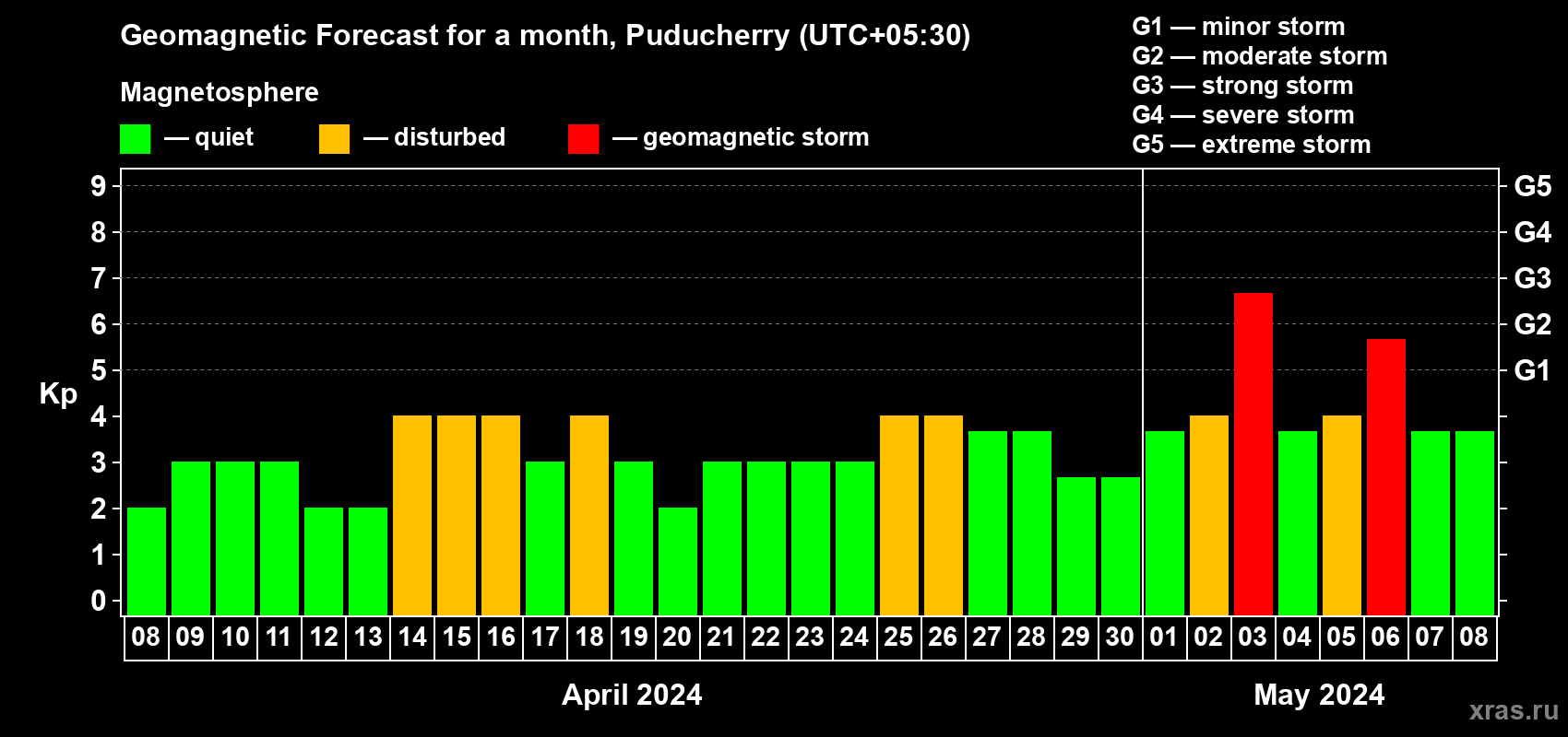 Geomagnetic storm forecast in Puducherry for Apr 08, 2024