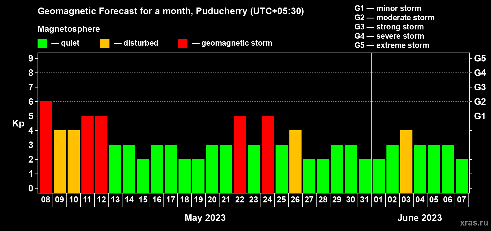 Geomagnetic storm forecast in Puducherry for May 08, 2023