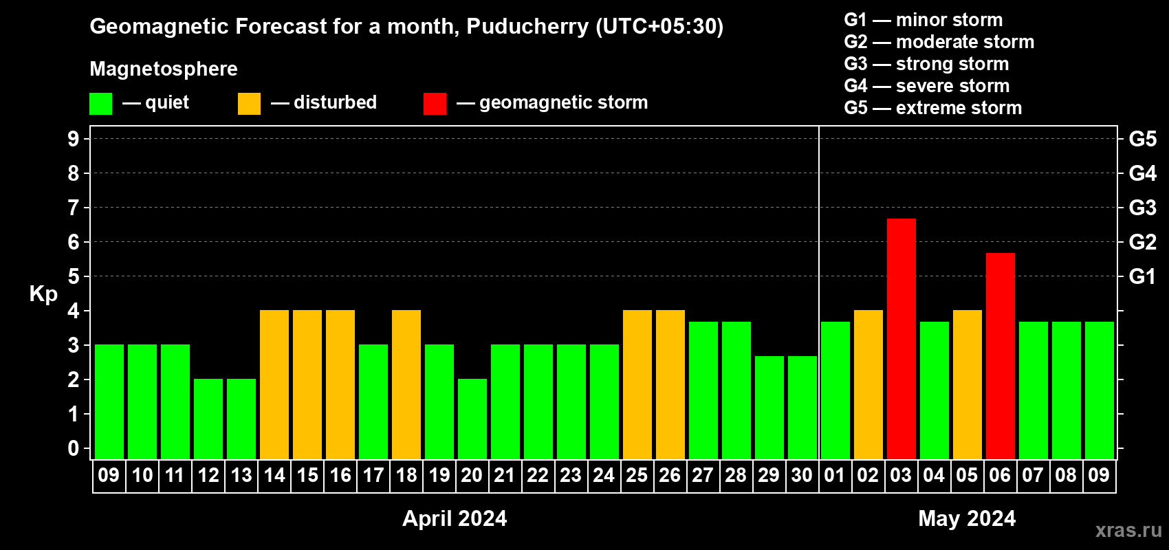 Geomagnetic storm forecast in Puducherry for Apr 09, 2024