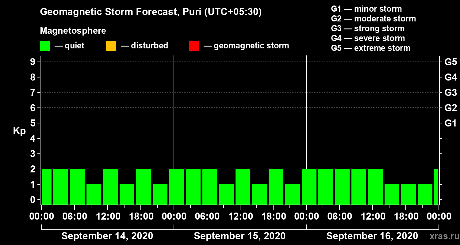 Geomagnetic storm forecast in Puri for Sep 14, 2020
