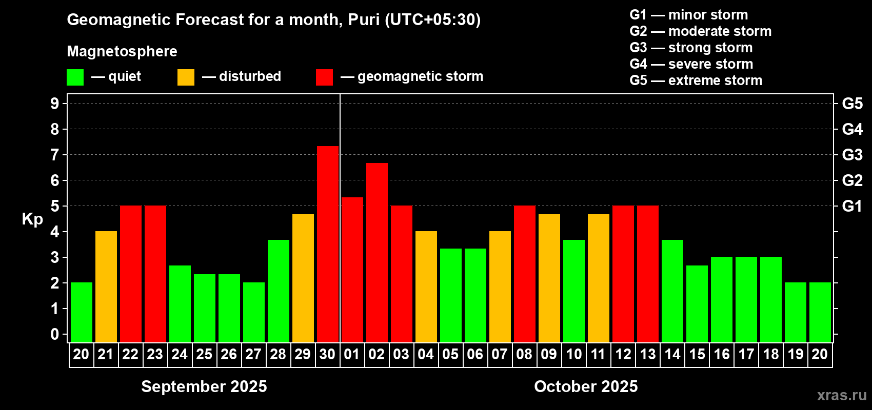 Geomagnetic storm forecast in Puri for Sep 20, 2025