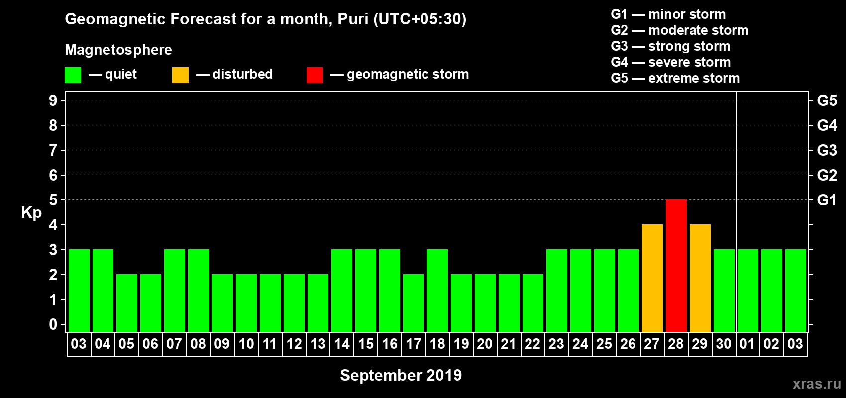 Geomagnetic storm forecast in Puri for Sep 03, 2019