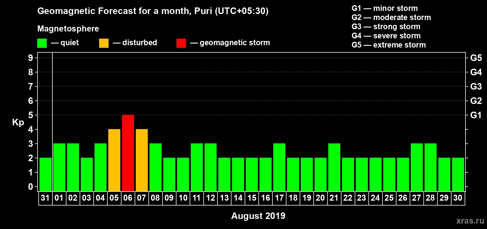 Geomagnetic storm forecast in Puri for Jul 31, 2019