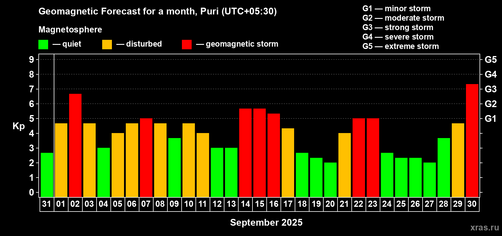 Geomagnetic storm forecast in Puri for Aug 31, 2025