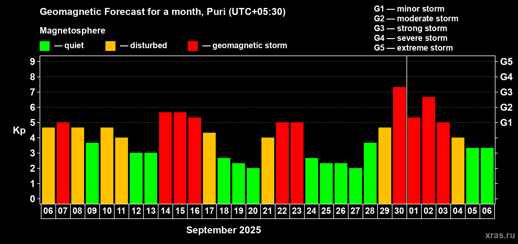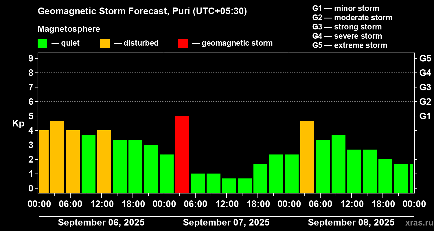 Geomagnetic storm forecast in Puri for Sep 06, 2025