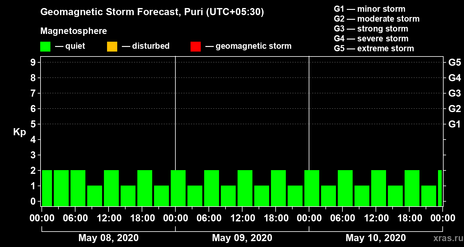 Geomagnetic storm forecast in Puri for May 08, 2020
