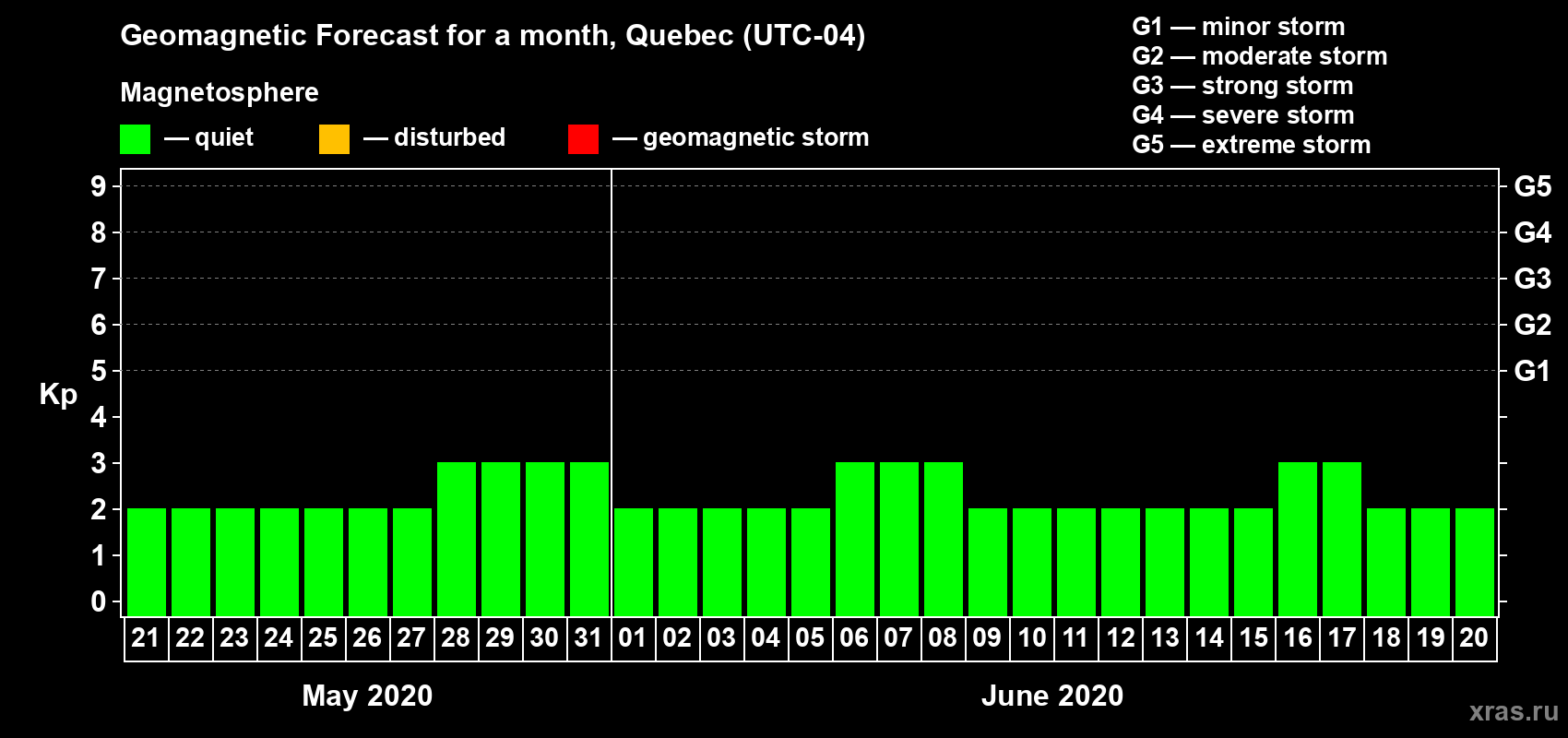 Geomagnetic activity forecast in Quebec — May 21, 2020