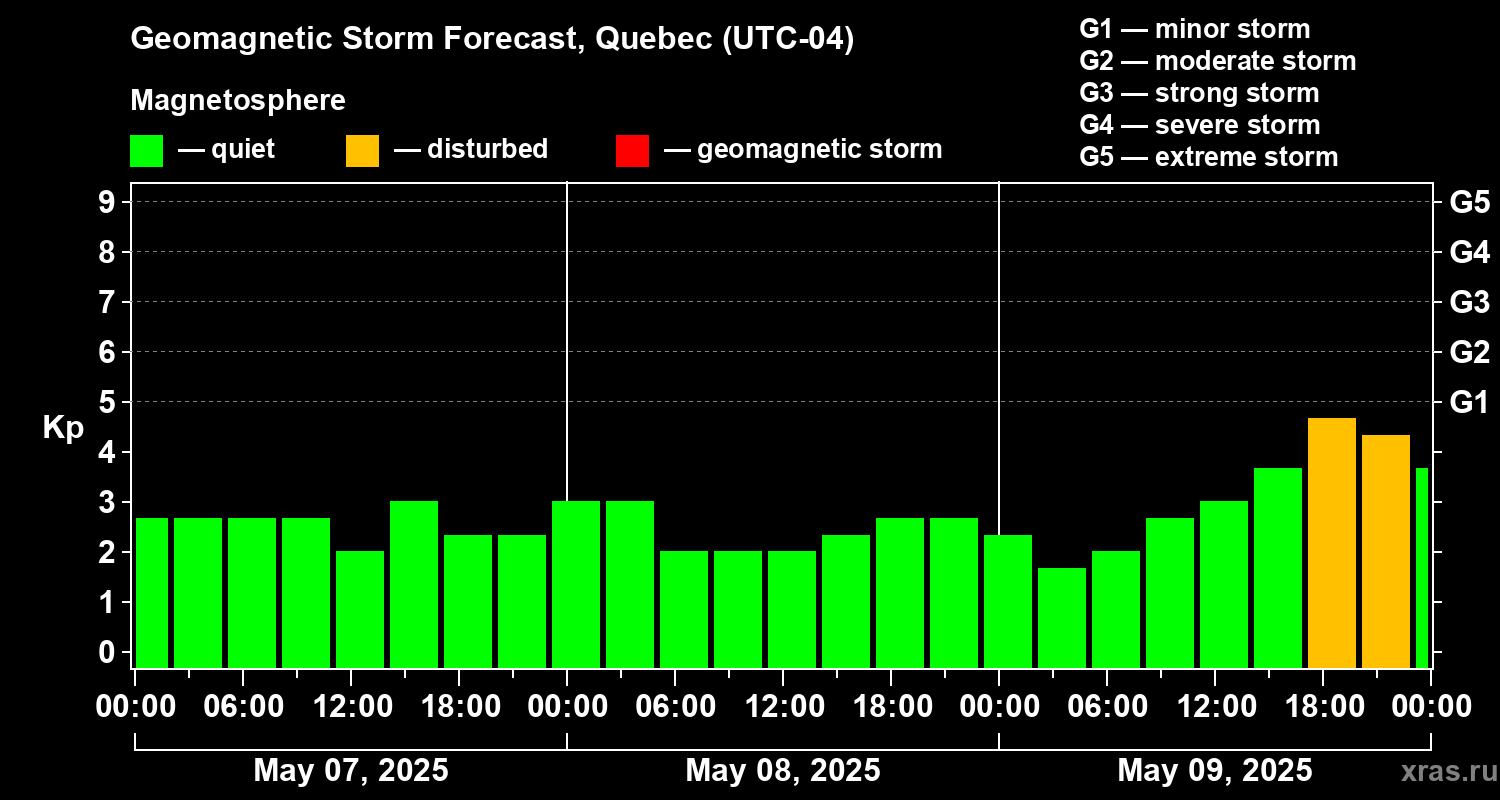 Geomagnetic storm forecast in Quebec for May 07, 2025