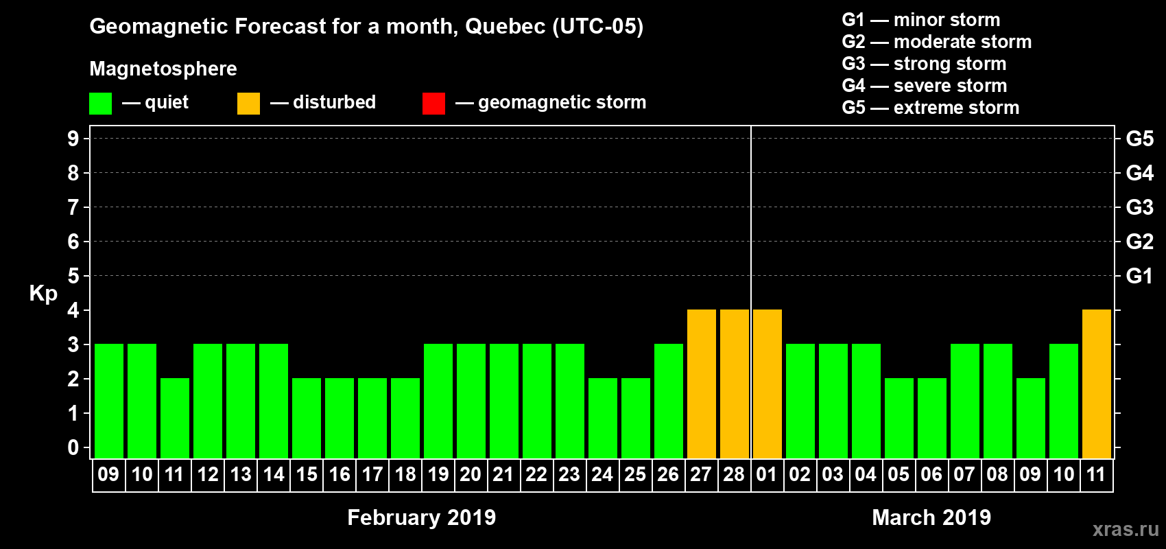 Geomagnetic activity forecast in Quebec — Feb 09, 2019
