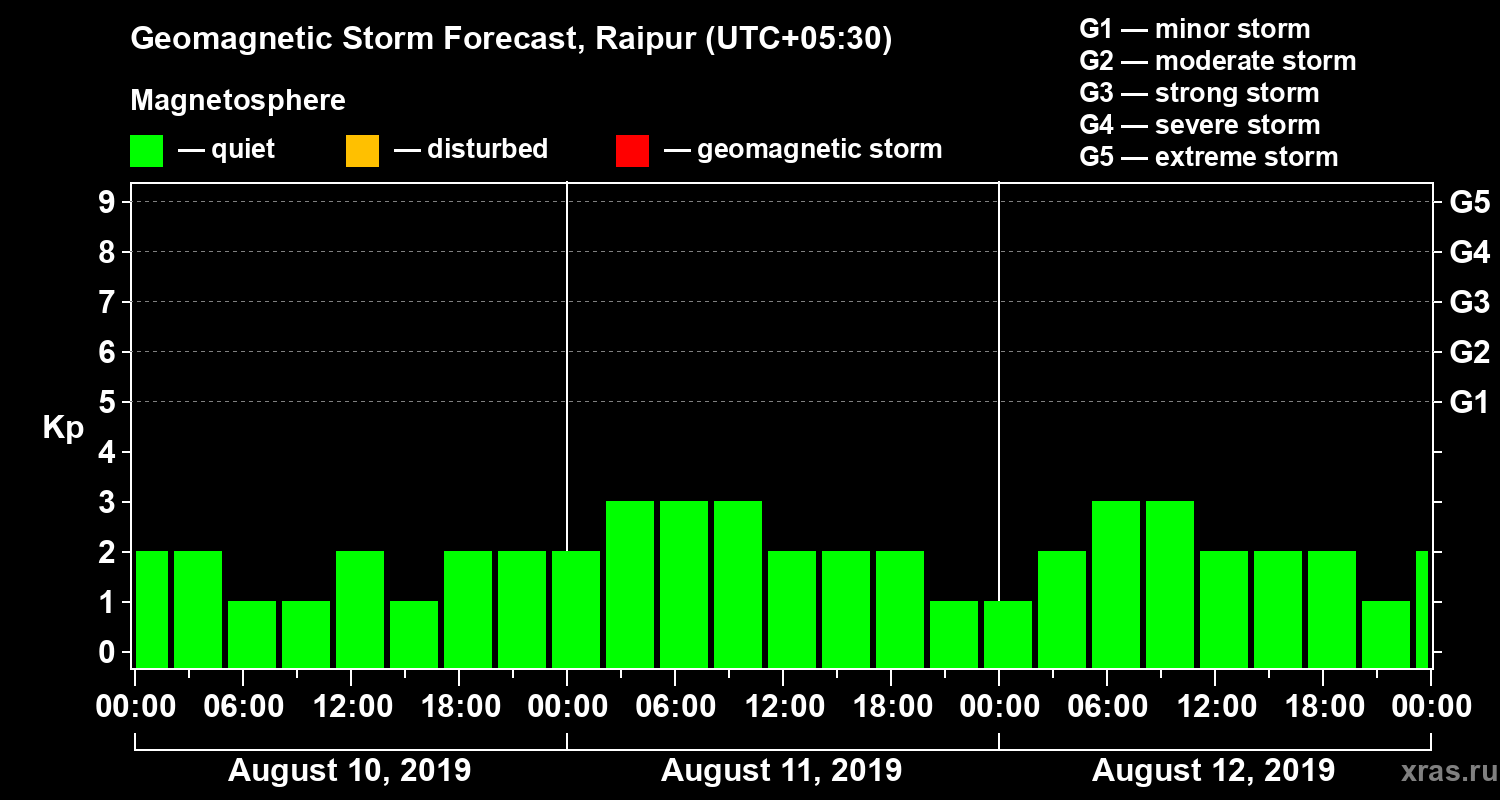Geomagnetic storm forecast in Raipur for Aug 10, 2019