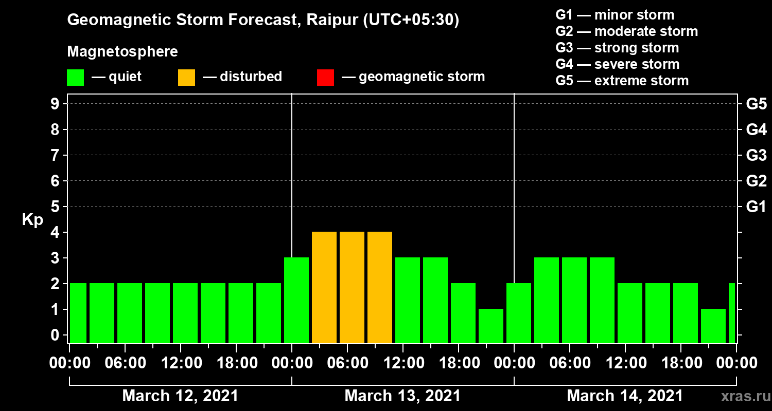 Geomagnetic storm forecast in Raipur for Mar 12, 2021