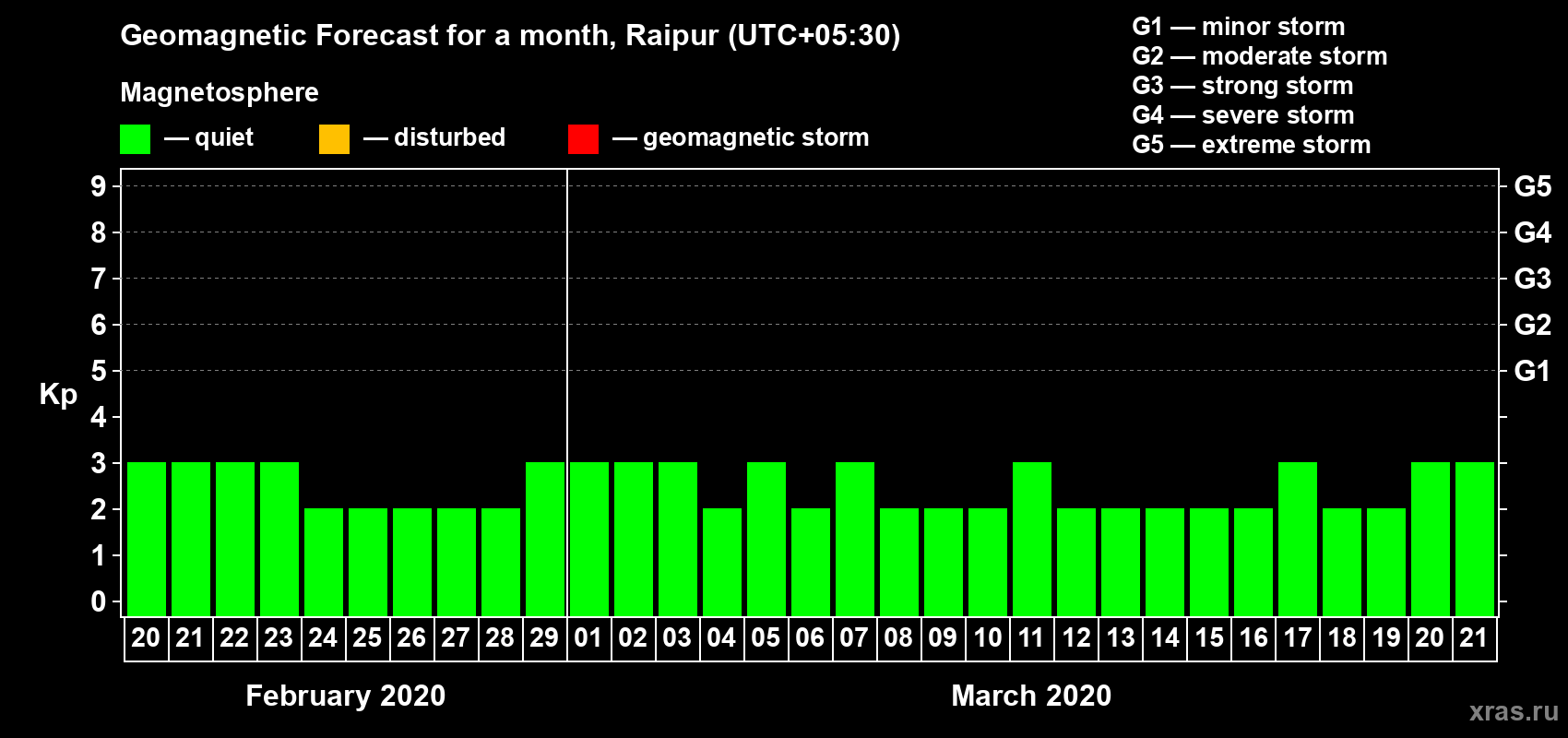 Geomagnetic storm forecast in Raipur for Feb 20, 2020