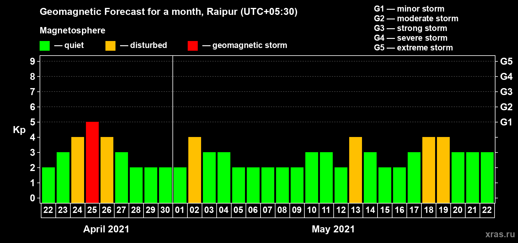 Geomagnetic storm forecast in Raipur for Apr 22, 2021