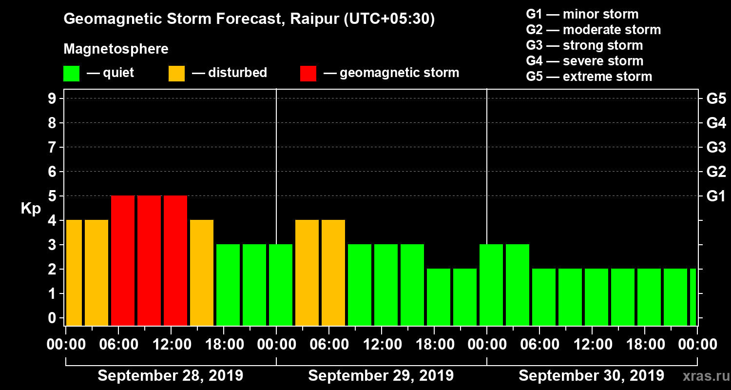 Geomagnetic storm forecast in Raipur for Sep 28, 2019