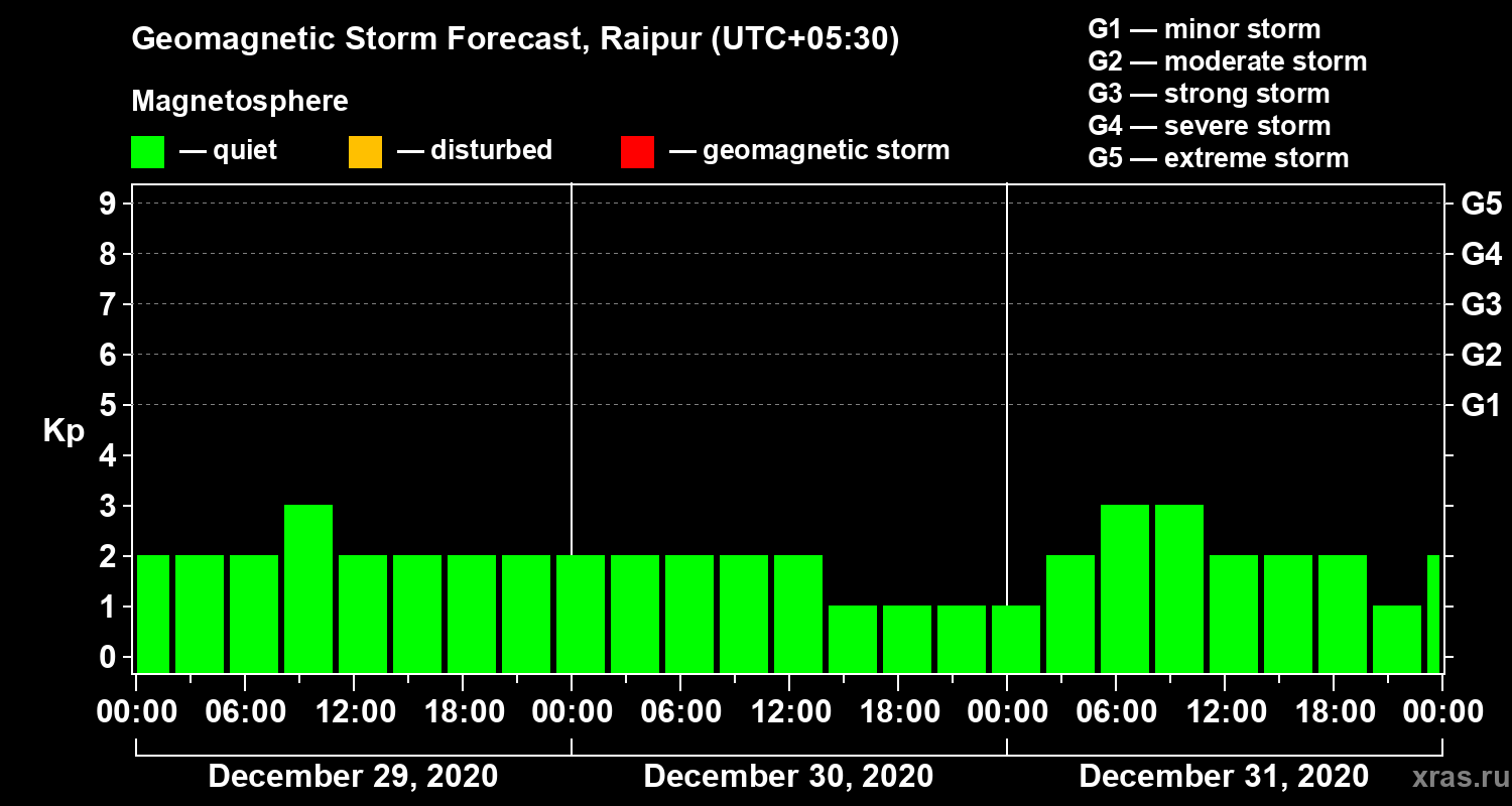 Geomagnetic storm forecast in Raipur for Dec 29, 2020